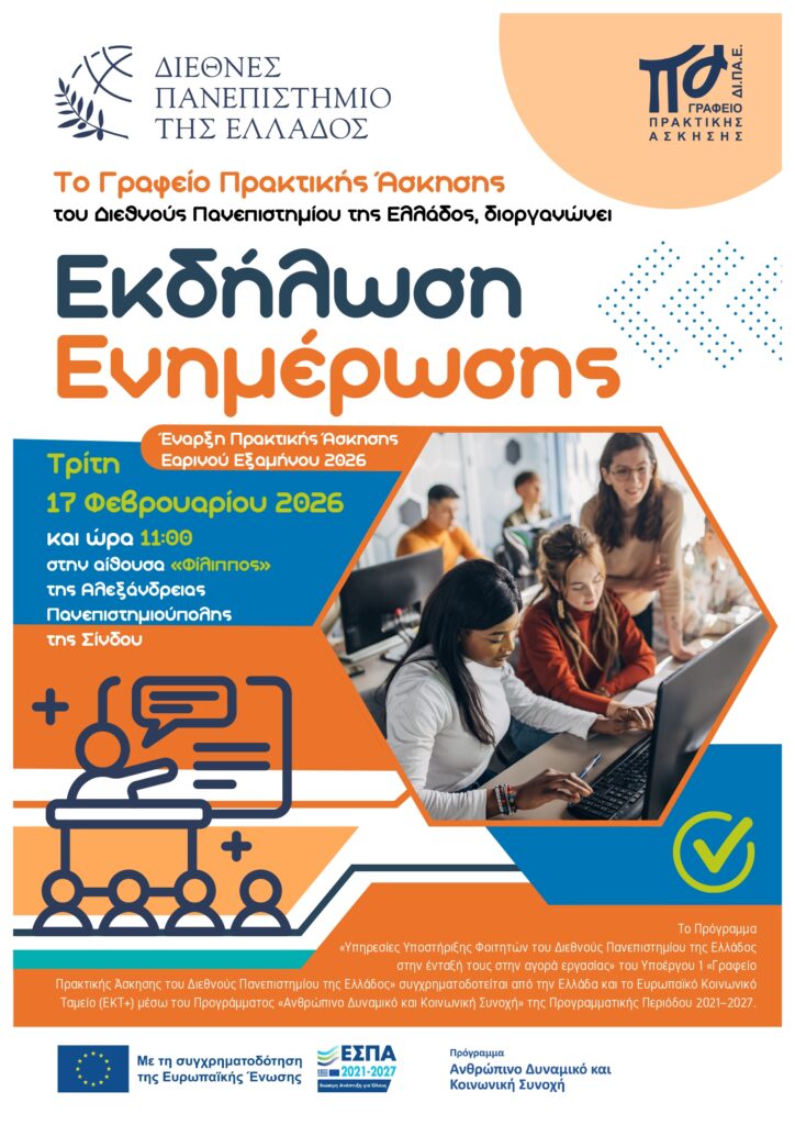 Το Γραφείο Πρακτικής Άσκησης του Διεθνούς Πανεπιστημίου της Ελλάδος, της Πράξης “Υπηρεσίες Υποστήριξης Φοιτητών του Διεθνούς Πανεπιστημίου της Ελλάδος στην ένταξή τους στην αγορά εργασίας» του Υποέργου 1 «Γραφείο Πρακτικής Άσκησης του Διεθνούς Πανεπιστημίου της Ελλάδος» συγχρηματοδοτείται από την Ελλάδα και το Ευρωπαϊκό Κοινωνικό Ταμείο (ΕΚΤ+), διοργανώνει εκδήλωση ενημέρωσης φοιτητών Πρακτικής Άσκησης που θα πραγματοποιηθεί την Τρίτη 17 Φεβρουαρίου 2026 και ώρα 11.00 στην αίθουσα «Φίλιππος» της Αλεξάνδρειας Πανεπιστημιούπολης της Σίνδου.